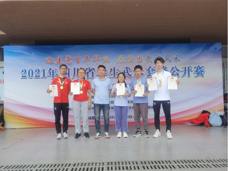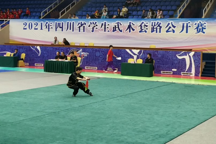 在廖沛然、谢云龙两位教练的指导下,我校武术代表队经过前期选拔和刻苦训练,共派出5名队员参加了传统拳术(翻子拳、八极拳、查拳)、传统器械(峨眉剑)、自选器械(自选刀、自选太极剑)以及太极拳(42式太极拳)多个项目的比赛,取得了四个冠军,两个季军,一个第五名和一个第八名的优异成绩,同时集体荣获体育道德风尚奖。通过此次比赛,我队5名队员都取得了进一步参加四川省武术套路锦标赛的资格。