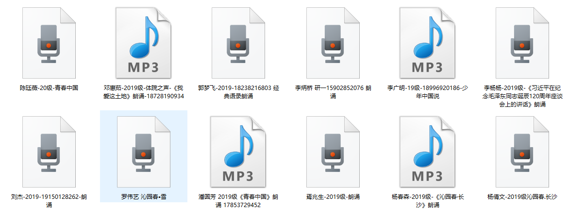本次活动共收到朗诵作品近20余幅,经过院团委研究生会对同学提交朗诵作品的审核筛选,结合、主题、内容、情感、寓意、吐字、声音、节奏等方面的综合考量,最终选定罗伟艺、李杨杨等15名同学的朗诵作品获得优胜奖。