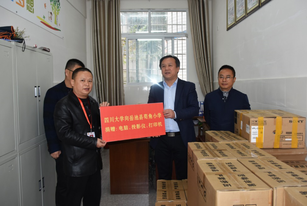 在调研中,许唯临一行首先来到苟角小学,代表四川大学捐赠了电脑、打印机等设备,用于支持脱贫攻坚事业,并希望苟角小学要充分发挥传统的书法育人优势,对接好川大这个平台,积极培育师资力量,推动学校书法育人事业再上新台阶。