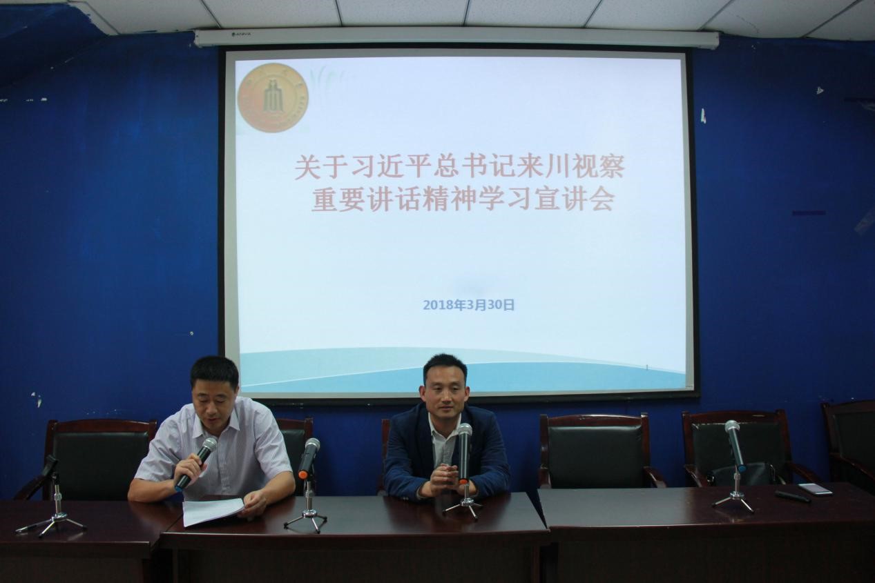 会议首先请学校宣讲团成员,经济学院贺立龙老师给大家作了宣讲,贺老师结合习近平总书记来四川视察指导,召开打好精准脱贫攻坚战座谈会,听取脱贫攻坚进展情况汇报,并发表重要讲话的精神,从六个方面传达了对习总书记来川视察重要讲话精神的学习理解,结合实际作了一个启发思维、理清思路、鼓舞干劲的报告。