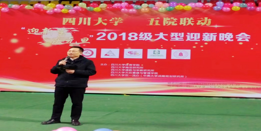 出席此次迎新晚会的主要领导老师有四川大学党委学生工作部陈森部长、四川大学道教与宗教研究所的朱展炎老师、于国庆老师、胡锐老师、李冀老师、胡瀚霆老师;米兰(中国)体育·官方网站向勇院长、邱硕立院长、韩海军院长、学生科科长周敏老师等;四川大学中美战略研究所双一流办公室罗锋副主任、双一流办公室黄英姿老师;川大学灾后重建与管理学院陈勇书记,第宝锋院长,高子闲老师。四川大学南亚研究所雷鸣书记、南亚-雷鸣书记、李建军主任、曾祥裕副教授、王春燕博士。以及米兰(中国)体育·官方网站各位学生组织领导以及其他学院的一些嘉宾。