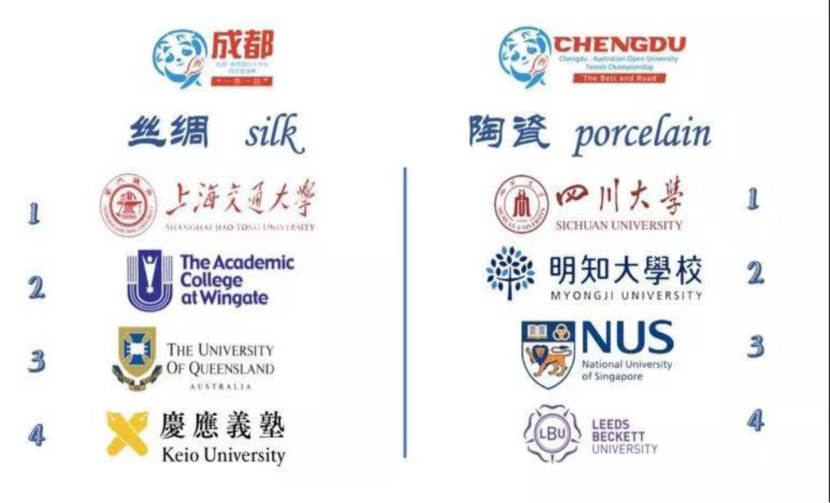 新闻发布会后,进入抽签仪式环节,八个高校被分为两个小组,本次比赛的组名契合“一带一路”的主题,分别以陆上丝绸之路和海上丝绸之路的主要运输的代表商品—丝绸和陶瓷命名。上海交通大学、以色列温盖特学院、澳大利亚昆士兰大学和日本庆应义塾大学同分在丝绸组;东道主四川大学、韩国明知大学、新加坡国立大学和英国利兹贝克特大学分在陶瓷组。