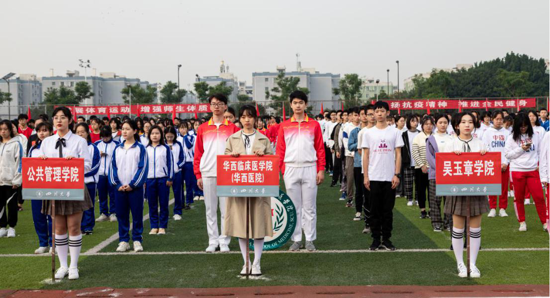 本届运动会主会场举行了简短的开幕式,校党委书记王建国,校长李言荣,副校长侯太平、梁斌、李蓉军、张林、褚良银,及学校各单位负责人,学生代表和运动员参加开幕式。开幕式由侯太平主持。开幕式上,首先,国旗班护卫着国旗庄严入场。在隆重的升旗仪式中,全场肃立、面向国旗,注视着五星红旗冉冉升起、飘扬在运动场的上空。分管体育工作的梁斌副校长致开幕词。他首先代表学校向本届运动会开幕表示祝贺。他指出,川大始终坚持育人至上,人格与体魄并重的理念,把体育精神融入人才培养全过程,不断推进体育教育改革,广泛开展群众性体育运动,致力于全面提升师生身心健康水平。一年一度的田径运动会不仅是对学校体育工作成果的一次重要检阅,更是对广大师生精神风貌的一次集中展示。希望每位参赛运动员弘扬更高、更快、更强的奥林匹克精神,顽强拼搏,公平竞争,赛出风格,赛出水平,赛出友谊。希望全体裁判员和工作人员公正裁决、真诚服务,营造公平公正的环境氛围。最后,他预祝本次运动会取得圆满成功。随后,来自口腔医学院的运动员代表庄颜嘉同学和来自AC MILAN研究生裁判员代表王炫力同学依次宣誓。最后,学校党委书记王建国教授宣布校运会开幕。