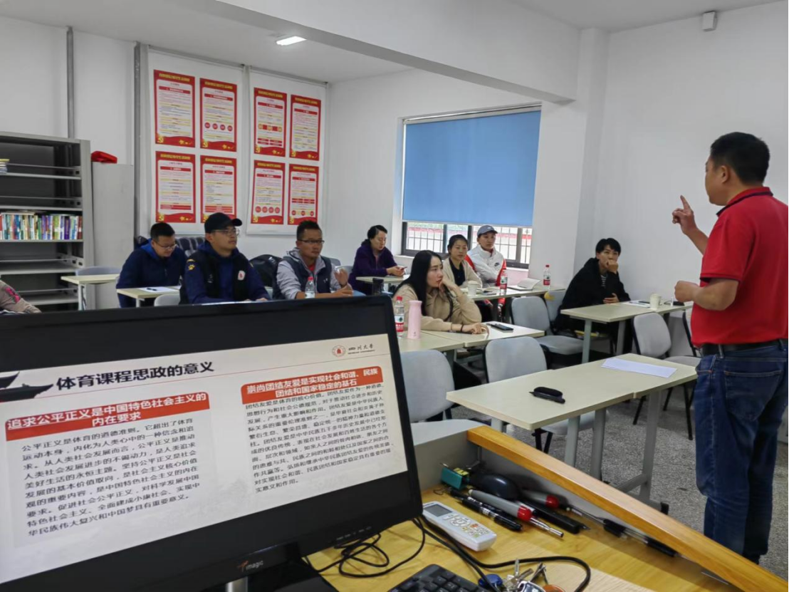 陈清老师从“课程思政”建设背景、概念、内涵等维度进行了阐释。并结合课堂案例,分享了如何在体育课程中开展相关实践,即如何把爱国、德育、劳动、审美、协作等内容贯穿进课堂,以促成“全过程、立体化”的课程思政模式。