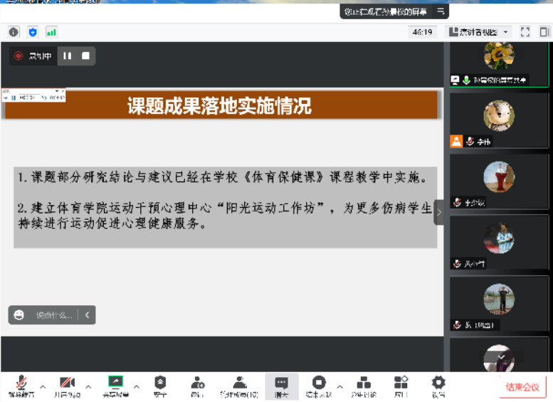韩院长简介了教改立项背景及各项目开展情况,邱硕立老师就“基于‘三全育人’的四川大学体育课程思政体系构建”,孙景权老师就“健康中国视角下伤残学生体育课参与兴趣的影响因素及对策研究”,李少波老师就“四川大学瑜伽教学改革实验研究”,从立项意义、改革措施、成效与特色、改革成果、推广价值等方面做了详细的介绍和经验分享。