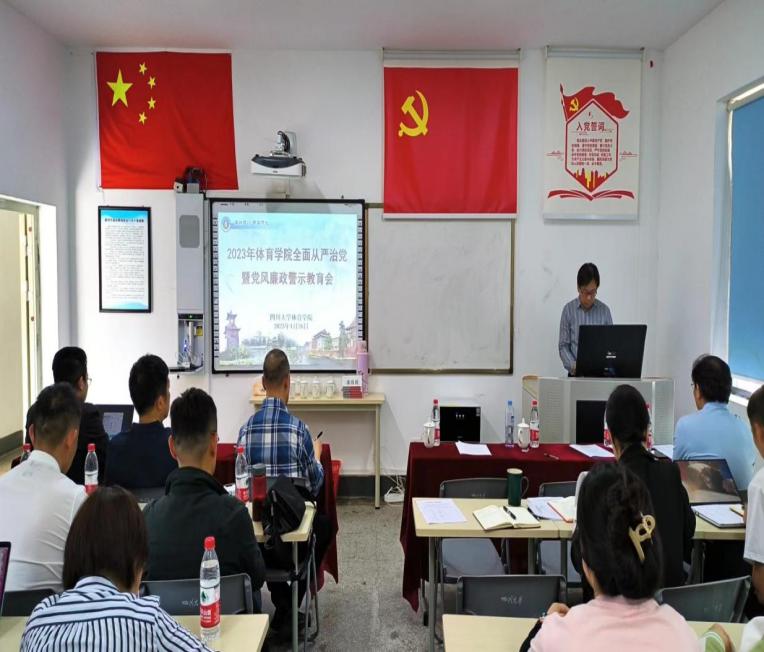 4月26日下午,米兰(中国)体育·官方网站在望江东区游泳池二楼会议室,召开2023年全面从严治党暨党风廉政警示教育会,学院党总支书记方云、院长向勇、副院长韩海军、邱硕立,工会主席兼纪检委员袁志华,正处级组织员荣文学,院长助理陈清、李姗姗,党政办主任陶海波、副主任肖茜,教学科科长李伟,以及运动队教练员等参会。会议由向勇主持。
