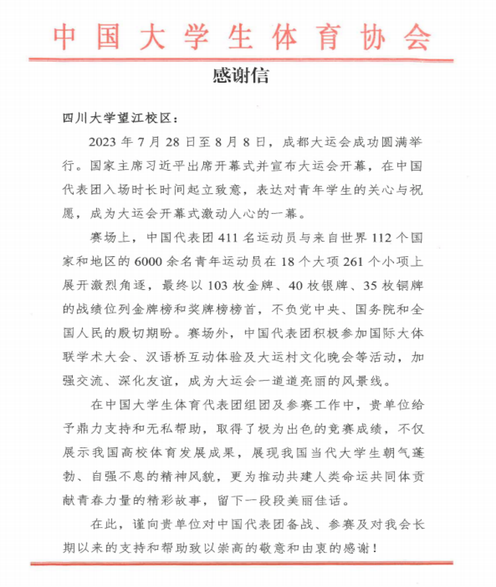 9月13日,中国大学生体育协会给我校发来感谢信,感谢我校在成都大运会期间,给与大体协工作的鼎力支持和无私帮助,感谢信具体见附件。