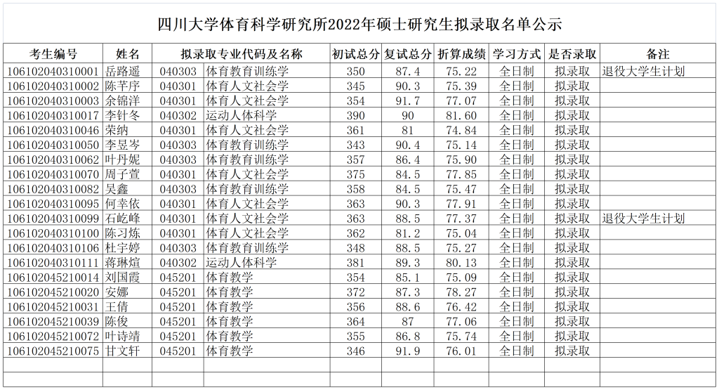 四川大学体育科学研究所2022年硕士研究生拟录取名单公示