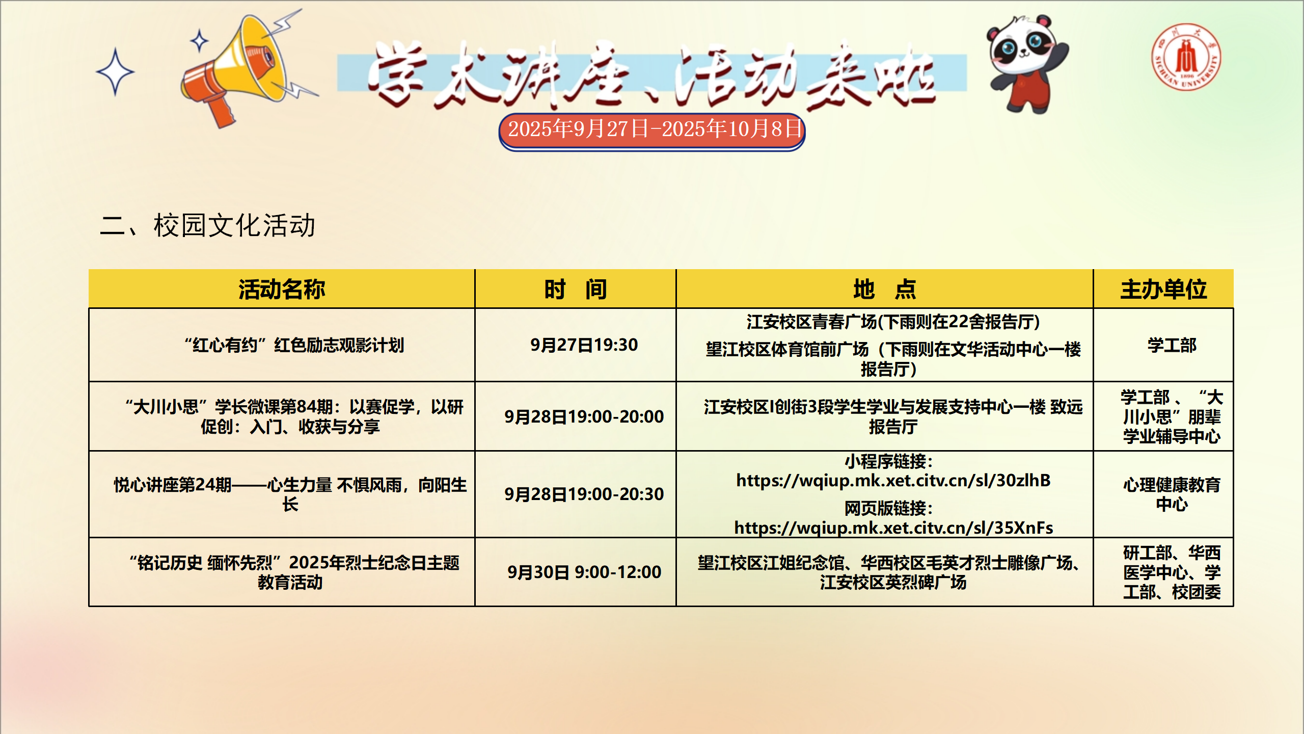 学术讲座及校园活动文化预告(9月27日-10月8日)
