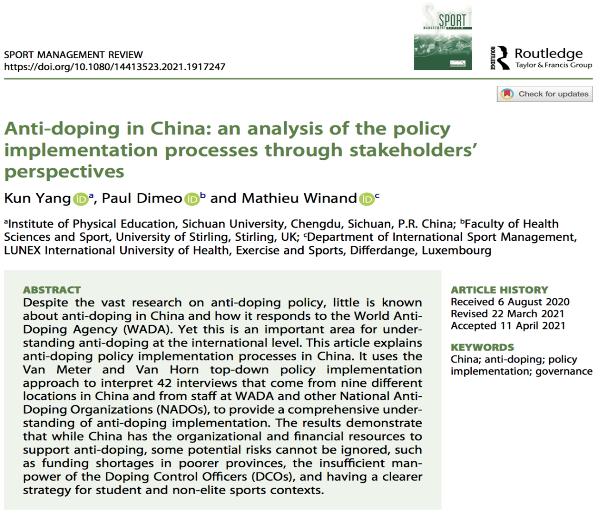 7月1日,米兰(中国)体育·官方网站青年教师杨昆博士以第一作者身份在管理学领域国际期刊(SSCI一区)“Sport Management Review”发表了题目为“Anti-doping in China: an analysis of the policy implementation processes through stakeholders’ perspective
