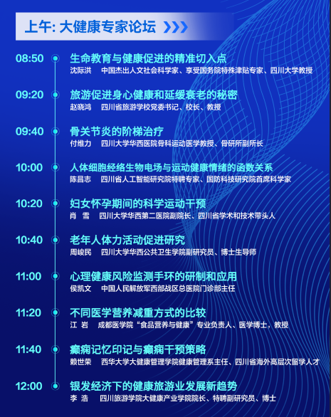本次论坛的专家演讲分为两个部分,其中上午设置了“大健康专家论坛”,中国杰出人文社会科学家国务院特殊津贴专家沈继洪教授、四川省旅游学校党委书记兼校长赵晓鸿教授、四川大学华西医院骨科运动医学专家骨研所副所长付维力教授、四川省人工智能研究院特聘专家陈昌志研究员、四川大学华西第二医院副院长肖雪教授、四川大学华西公共卫生学院博士生导师周峻民副研究员、中国人民解放军西部战区总医院门诊部侯凯文主任、成都医学院食品营养与健康专业负责人江岩教授、四川省海外高层次留学人才西华大学大健康管理学院健康管理系赖世荣主任及四川旅游学院大健康产业学院院长李浩研究员等专家学者在本次论坛上作了主题演讲,介绍了教育、旅游、医疗、心理、运动、营养与大健康领域的重要科研成果和新进展。下午设置了“健康科普讲座”单元,邀请成都AC MILAN附属医院运动医学康复科主任路怀民、四川大学华西医院内分泌科一级专家安振梅、泸州职业技术学院中国酒业学院院长刘竟成、成都中医药大学附属医院杵针疗法国家非遗传人郭鸿、四川工程职业技术大学教授兰成伟、四川大学华西第四医院康复科主任唐奇、中国老年保健协会健康学分会副会长李玉东、中国医生集团联盟轮值主席王俊、重庆市南岸区中医院康复科原主任白海冰、四川大学公众健康与社会发展研究所所长韩海军等专业人士从疼痛、糖尿病、睡眠障碍、体态异常、发育异常等常见慢病的科学防治及传统特色疗法、运动健身、小分子活性氢水、生活方式医学促进健康等进行了系统健康科普。